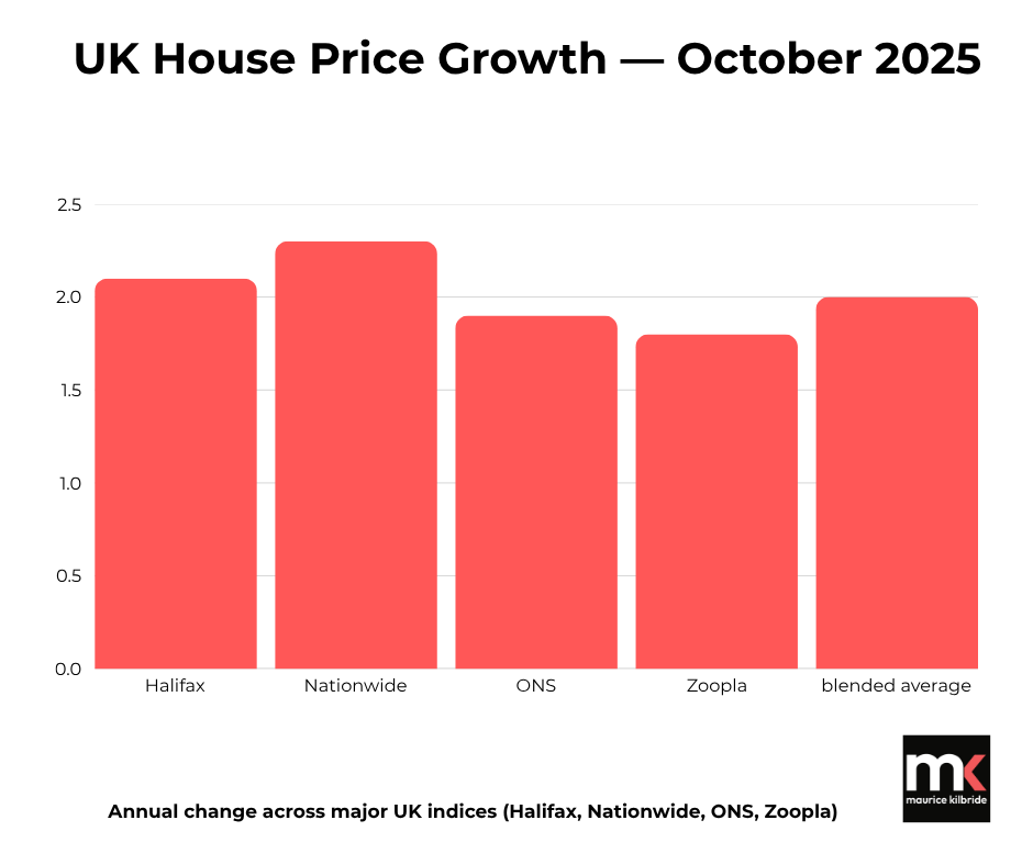 | Annual price growth | +2.4% (Nationwide) | +3.9% (ONS) | +4.5% (ONS/Local) |