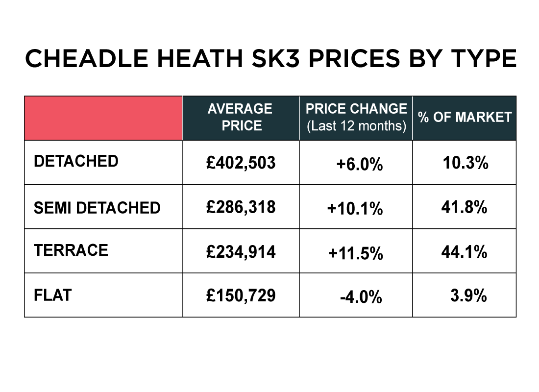 The average property price in SK8 now stands at £370,041, a 3.3% increase year on year. Prices are up in all types of property, other than flats.