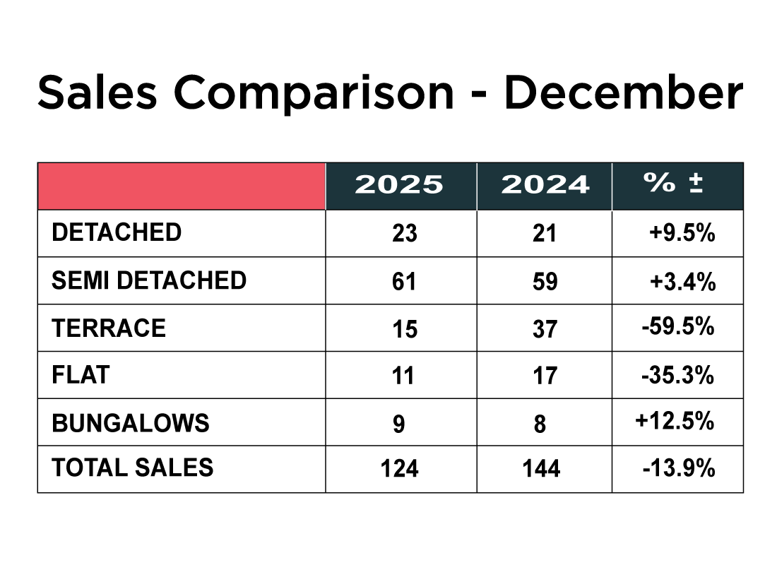 Terraced homes: Down substantially from 37 last year, to just 15 in 2025 (-59.5%), which reflects the lack of first time buyers who have been in the market over the last couple of months.